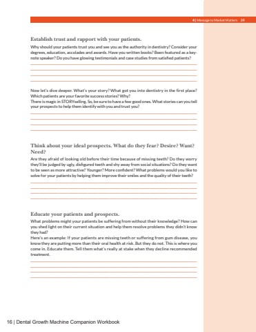 4 | Message to Market Matters 39Establish trust and rapport with your patients.Why should your patients trust you and see you as the authority in dentistry? Consider your degrees, education, accolades and awards. Have you written books? Been featured as a keynote speaker? Do you have glowing testimonials and case studies from satisfied patients?____________________________________________________________________________________________________________________________________________________________________________________________________________________________________________________________________________________________________________________________________________________________________________________________________________________Now let%u2019s dive deeper. What%u2019s your story? What got you into dentistry in the first place? Which patients are your favorite success stories? Why?There is magic in STORYselling. So, be sure to have a few good ones. What stories can you tell your prospects to help them identify with you and trust you?____________________________________________________________________________________________________________________________________________________________________________________________________________________________________________________________________________________________________________________________________________________________________________________________________________________Think about your ideal prospects. What do they fear? Desire? Want? Need?Are they afraid of looking old before their time because of missing teeth? Do they worry they%u2019ll be judged by ugly, disfigured teeth and shy away from social situations? Do they want to be seen as more attractive? Younger? More confident? What problems would you like to solve for your patients by helping them improve their smiles and the quality of their teeth?____________________________________________________________________________________________________________________________________________________________________________________________________________________________________________________________________________________________________________________________________________________________________________________________________________________Educate your patients and prospects.What problems might your patients be suffering from without their knowledge? How can you shed light on their current situation and help them resolve problems they didn%u2019t know they had?Here%u2019s an example: If your patients are missing teeth or suffering from gum disease, you know they are putting more than their oral health at risk. But they do not. This is where you come in. Educate them. Tell them what%u2019s really at stake when they decline recommended treatment.____________________________________________________________________________________________________________________________________________________________________________________________________________________________________________________________________________________________________________________________________________________________________________________________________________________40 Dental Growth Machine: Transform Your Practice by Attracting High-Value Patients Who Pay, Stay, and Refer WorkbookGive them additional reasons the dental treatment you recommend is right for them.Here%u2019s an example. If you%u2019re talking about dental implants, discuss their regenerative nature, how they look and feel natural in the mouth, and so on. Talk about how, without a permanent solution to their missing teeth, patients can expect bone degeneration in their jaw and a cascade of negative health problems.Whatever high-value treatments you recommend, be ready with a list of benefits they can expect by saying yes to that treatment and a list of consequences they may expect if they say no.____________________________________________________________________________________________________________________________________________________________________________________________________________________________________________________________________________________________________________________________________________________________________________________________________________________Once you%u2019ve crafted a compelling message, use it to gain your prospects%u2019 attention. If you show up in an overstuffed inbox or a circular they%u2019re likely to throw away, your message will be lost. However, if your message shows up in a FedEx envelope, chances are high your prospect will pay attention. Yes, there is an extra cost for this, but if it means you attract more patients eager to say yes to high-end dentistry, it%u2019s worth it. If you%u2019ve spent time with this workbook, you have the elements of a great sales message. If you still have concerns about creating this message yourself, go to my chapter on Samples and Swipe Files. I have examples of sales letters you can use to get your creative juices flowing.With what you gathered in this chapter and the work you put into the workbook, you%u2019re ready to move on to the next step: Your Multimedia Message.16 | Dental Growth Machine Companion Workbook