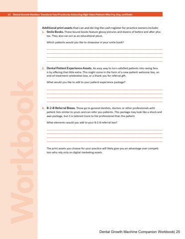 7 | Selling in Print Part II 61_____________________________________________________________________________________________________________________________________________________________________________________________________________________________________________________________________________________________________________________________________________________________________________________________________________________________________________________________________________________________________________________________________________________________________________________________________________________________________________________________________________________________________________________________________________________________________________________________________________________________________________________________________________________________________________________________________________PostcardA postcard is an executive summary document describing the benefits of the proposed treat,ment or program. This visual represents life AFTER patients agree to an implant procedure or your recommended treatment.What ideas would you like to add to this postcard?_________________________________________________________________________________________________________________________________________________________________________________________________________________________________________________________________________________________________________________________________________________________________________________________________________________________________________________________________________________________________________________________Step-By-Step GuideThis step-by-step process flowchart details what patients can expect during their scheduled treatments._________________________________________________________________________________________________________________________________________________________________________________________________________________________________________________________________________________________________________________________________________________________________________________________________________________________________________________________________________________________________________________________Treatment/Service OptionsThis multi-page booklet describes (with pictures, illustrations and text) your patients%u2019 op,tions. This may include less expensive treatment. Compare and contrast these options._________________________________________________________________________________________________________________________________________________________________________________________________________________________________________________________________________________________________________________________________________________________________________________________________________________________________________________________________________________________________________________________TestimonialsThe testimonials section of your case presentation will be similar to the one in your shock and awe package. This celebratory document offers social proof through happy patients and smiling faces._________________________________________________________________________________________________________________________________________________________________________________________________________________________________________________________________________________________________________________________________________________________________________________________________________________________________________________________________________________________________________________________62 Dental Growth Machine: Transform Your Practice by Attracting High-Value Patients Who Pay, Stay, and Refer WorkbookAdditional print assets that can and do ring the cash register for practice owners include:1. Smile Books. These bound books feature glossy pictures and dozens of before and after photos. They also can act as an educational piece.Which patients would you like to showcase in your smile book?____________________________________________________________________________________________________________________________________________________________________________________________________________________________________________________________________________________________________________________________________________________________________________________________________2. Dental Patient Experience Assets. An easy way to turn satisfied patients into raving fans is by offering that little extra. This might come in the form of a new patient welcome box, an end-of-treatment celebration box, or a thank you for referral gift.What would you like to add to your patient experience package?____________________________________________________________________________________________________________________________________________________________________________________________________________________________________________________________________________________________________________________________________________________________________________________________________3. B-2-B Referral Boxes. These go to general dentists, doctors or other professionals with patient lists similar to yours and can refer you patients. This package may look like a shock and awe package, but it is tailored more to the professional than the patient.What elements would you add to your B-2-B referral box?____________________________________________________________________________________________________________________________________________________________________________________________________________________________________________________________________________________________________________________________________________________________________________________________________The print assets you choose f