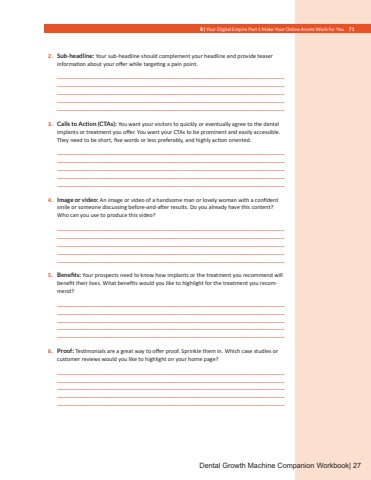 70 Dental Growth Machine: Transform Your Practice by Attracting High-Value Patients Who Pay, Stay, and Refer WorkbookYour Digital Empire Part I WorkbookCraft and present compelling content online and through email that grabs and holds your readers%u2019 attention and makes them interested in what you offer and eager to accept treat,ment. This workbook will help you create compelling web pages that resonate with your prospects. For more examples of successful pixel estate pages, please see the chapter on Samples and Swipe Files.CREATING YOUR PIXEL ESTATEYour pixel estate is your online storefront where your prospects and patients go to do busi,ness with you. If you want your website to work for you and draw in your ideal prospects, it needs to have the following key pages:%u2022 Home Page%u2022 Cold Page%u2022 Warm Page%u2022 Hot Page%u2022 Landing PageTo optimize each page, first ask:%u2022 What does my ideal prospects want?%u2022 What problem drove them to look for a solution on your website?%u2022 What information are they seeking as a solution to their problem?%u2022 How can you give them the information they need so they trust you and see you as the source they seek to solve their problems?Each page must have:%u2022 A compelling headline%u2022 A Call to Action (CTA)%u2022 Important information your readers need to know%u2022 Additional CTAs at various places on each page that go to a place where prospects can contact you or schedule an appointment.%u2022 Content that focuses on your patients%u2019 problems and how they can immediately resolve them with the treatment you recommend.Your Home Page: Your Practice%u2019s First ImpressionThere are 14 key content features vital to your home page%u2019s success:1. Logo and headline: Aim for a clear, simple headline that, in a few seconds, clearly defines what you offer and what you are about.__________________________________________________________________________________________________________________________________________________________________________________________________________________________________________________________________________________________________________________________________________________________________________________________________________________________________________________________________________________________________________________________________________________8 | Your Digital Empire Part I: Make Your Online Assets Work for You 712. Sub-headline: Your sub-headline should complement your headline and provide teaser information about your offer while targeting a pain point.__________________________________________________________________________________________________________________________________________________________________________________________________________________________________________________________________________________________________________________________________________________________________________________________________________________________________________________________________________________________________________________________________________________3. Calls to Action (CTAs): You want your visitors to quickly or eventually agree to the dental implants or treatment you offer. You want your CTAs to be prominent and easily accessible. They need to be short, five words or less preferably, and highly action oriented.__________________________________________________________________________________________________________________________________________________________________________________________________________________________________________________________________________________________________________________________________________________________________________________________________________________________________________________________________________________________________________________________________________________4. Image or video: An image or video of a handsome man or lovely woman with a confident smile or someone discussing before-and-after results. Do you already have this content? Who can you use to produce this video?__________________________________________________________________________________________________________________________________________________________________________________________________________________________________________________________________________________________________________________________________________________________________________________________________________________________________________________________________________________________________________________________________________________5. Benefits: Your prospects need to know how implants or the treatment you recommend will benefit their lives. What benefits would you like to highlight for the treatment you recommend?__________________________________________________________________________________________________________________________________________________________________________________________________________________________________________________________________________________________________________________________________________________________________________________________________________________________________________________________________________________________________________________________________________________6. Proof: Testimonials are a great way to offer proof. Sprinkle them in. Which case studies or customer reviews would you like to highlight on your home page?_________________________________________________________________________________________________________________________________________________________________________________________________________________________________________________________________________________________________________________________________________________________________________________________________________________________________________________________