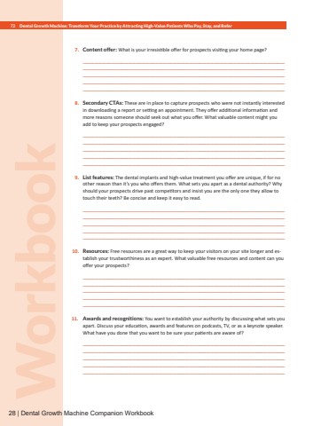 72 Dental Growth Machine: Transform Your Practice by Attracting High-Value Patients Who Pay, Stay, and Refer Workbook7. Content offer: What is your irresistible offer for prospects visiting your home page?__________________________________________________________________________________________________________________________________________________________________________________________________________________________________________________________________________________________________________________________________________________________________________________________________________________________________________________________________________________________________________________________________________________8. Secondary CTAs: These are in place to capture prospects who were not instantly interested in downloading a report or setting an appointment. They offer additional information and more reasons someone should seek out what you offer. What valuable content might you add to keep your prospects engaged?__________________________________________________________________________________________________________________________________________________________________________________________________________________________________________________________________________________________________________________________________________________________________________________________________________________________________________________________________________________________________________________________________________________9. List features: The dental implants and high-value treatment you offer are unique, if for no other reason than it%u2019s you who offers them. What sets you apart as a dental authority? Why should your prospects drive past competitors and insist you are the only one they allow to touch their teeth? Be concise and keep it easy to read.__________________________________________________________________________________________________________________________________________________________________________________________________________________________________________________________________________________________________________________________________________________________________________________________________________________________________________________________________________________________________________________________________________________10. Resources: Free resources are a great way to keep your visitors on your site longer and establish your trustworthiness as an expert. What valuable free resources and content can you offer your prospects?__________________________________________________________________________________________________________________________________________________________________________________________________________________________________________________________________________________________________________________________________________________________________________________________________________________________________________________________________________________________________________________________________________________11. Awards and recognitions: You want to establish your authority by discussing what sets you apart. Discuss your education, awards and features on podcasts, TV, or as a keynote speaker. What have you done that you want to be sure your patients are aware of?__________________________________________________________________________________________________________________________________________________________________________________________________________________________________________________________________________________________________________________________________________________________________________________________________________________________________________________________________________________________________________________________________________________8 | Your Digital Empire Part I: Make Your Online Assets Work for You 7312. Cold PageWhat problems might prospective patients face without their awareness? Use your cold page to discuss these problems and identify the pain points and consequences.Here%u2019s an example: If patients are missing teeth, they might be aware they have problems chewing or hate the way the missing tooth looks in their mouth, but they may not be aware of the risk they are of degenerative changes to their jawbone and facial structure.Start with a catchy headline and establish trust and credibility. Your job is to offer valuable information and answer questions you know prospects might ask. The CTA on a cold page might allow them to download a free special report on the subjects you cover. Brainstorm some ideas for the content you might add on your cold page:______________________________________________________________________________________________________________________________________________________________________________________________________________________________________________________________________________________________________________________________________________________________________________________________________________________________________________________________________________________________________________________________________________________________________________________________________________________________________________________________________________________________________________________________________________________________________________________________________________________________________________________________________________________________________________________________________________________________________________________________________________________________________________________________________________________________________________________________________________________________________________________________________________________________________________