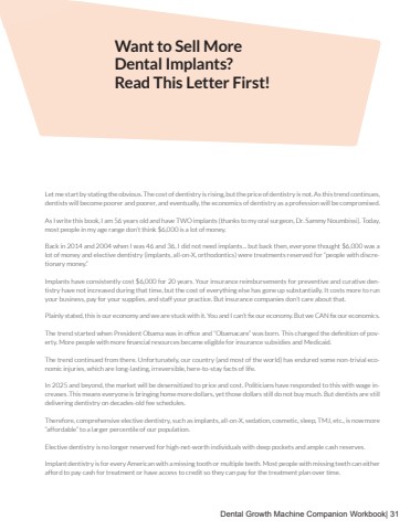 74 Dental Growth Machine: Transform Your Practice by Attracting High-Value Patients Who Pay, Stay, and Refer Workbook14. Hot PageThis is where you convert prospects into patients by showing them the value they will re,ceive by agreeing to the treatment you recommend.Your hot page needs to Identify the problem. Agitate the issue. Discredit alternate solutions. Solve the problem. Refer back to the conversation in Chapter 8 about the PADS technique, then spend a few moments brainstorming on the topics you would like to cover on your hot page:________________________________________________________________________________________________________________________________________________________________________________________________________________________________________________________________________________________________________________________________________________________________________________________________________________________________________________________________________________________________________________________________________________________________________________________________________________________________________________________________________________________________________________________________________________________________________________________________________________________________________________________________________________________________________________________________________________________________________________________________________________________________________________________________________________________________________________________________________________________________________________________________________________________________________________________________________________________________________________________________________________________________________________________________________________________________________________________________________________________________________________________________________________________________________________________________________________________________________________________________________________________________________________________________________________________________________________________________________________________________________________________________________________________________________________________________________________________________________________________________________________________________________________________________________________________________________________________________________________________________________________________________________Want to Sell More Dental Implants? Read This Letter First!Let me start by stating the obvious. The cost of dentistry is rising, but the price of dentistry is not. As this trend continues, dentists will become poorer and poorer, and eventually, the economics of dentistry as a profession will be compromised.As I write this book, I am 56%u00a0years old and have TWO implants (thanks to my oral surgeon, Dr. Sammy Noumbissi). Today, most people in my age range don%u2019t think $6,000 is a lot of money.Back in 2014 and 2004 when I was 46 and 36, I did not need implants... but back then, everyone thought $6,000 was a lot of money and elective dentistry (implants, all-on-X, orthodontics) were treatments reserved for %u201cpeople with discretionary money.%u201dImplants have consistently cost $6,000 for 20%u00a0years. Your insurance reimbursements for preventive and curative dentistry have not increased during that time, but the cost of everything else has gone up substantially. It costs more to run your business, pay for your supplies, and staff your practice. But insurance companies don%u2019t care about that.Plainly stated, this is our economy and we are stuck with it. You and I can%u2019t fix our economy. But we CAN fix our economics.The trend started when President Obama was in office and %u201cObamacare%u201d was born. This changed the definition of poverty. More people with more financial resources became eligible for insurance subsidies and Medicaid.The trend continued from there. Unfortunately, our country (and most of the world) has endured some non-trivial economic injuries, which are long-lasting, irreversible, here-to-stay facts of life.In 2025 and beyond, the market will be desensitized to price and cost. Politicians have responded to this with wage increases. This means everyone is bringing home more dollars, yet those dollars still do not buy much. But dentists are still delivering dentistry on decades-old fee schedules.Therefore, comprehensive elective dentistry, such as implants, all-on-X, sedation, cosmetic, sleep, TMJ, etc., is now more %u201caffordable%u201d to a larger percentile of our population.Elective dentistry is no longer reserved for high-net-worth individuals with deep pockets and ample cash reserves.Implant dentistry is for every American with a missing tooth or multiple teeth. Most people with missing teeth can either afford to pay cash for treatment or have access to credit so they can pay for the treatment plan over time.Dental Growth Machine Companion Workbook| 31