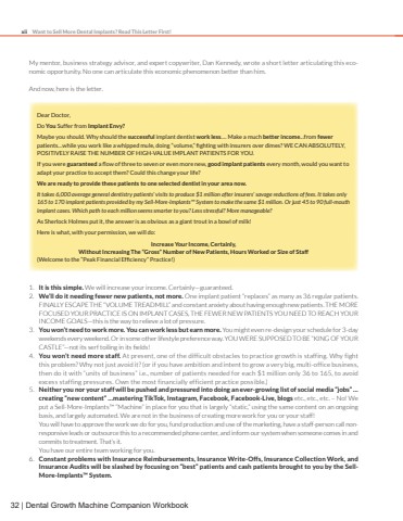 xii Want to Sell More Dental Implants? Read This Letter First! My mentor, business strategy advisor, and expert copywriter, Dan Kennedy, wrote a short letter articulating this economic opportunity. No one can articulate this economic phenomenon better than him.And now, here is the letter.Dear Doctor,Do You Suffer from Implant Envy?Maybe you should. Why should the successful implant dentist work less%u2026. Make a much better income...from fewerpatients%u2026while you work like a whipped mule, doing %u201cvolume,%u201d fighting with insurers over dimes? WE CAN ABSOLUTELY, POSITIVELY RAISE THE NUMBER OF HIGH-VALUE IMPLANT PATIENTS FOR YOU.If you were guaranteed a flow of three to seven or even more new, good implant patients every month, would you want to adapt your practice to accept them? Could this change your life?We are ready to provide these patients to one selected dentist in your area now.It takes 6,000 average general dentistry patients%u2019 visits to produce $1 million after insurers%u2019 savage reductions of fees. It takes only 165 to 170 implant patients provided by my Sell-More-Implants%u2122 System to make the same $1 million. Or just 45 to 90 full-mouth implant cases. Which path to each million seems smarter to you? Less stressful? More manageable?As Sherlock Holmes put it, the answer is as obvious as a giant trout in a bowl of milk!Here is what, with your permission, we will do:Increase Your Income, Certainly,Without Increasing The %u201cGross%u201d Number of New Patients, Hours Worked or Size of Staff(Welcome to the %u201cPeak Financial Efficiency%u201d Practice!)1. It is this simple. We will increase your income. Certainly%u2014guaranteed.2. We%u2019ll do it needing fewer new patients, not more. One implant patient %u201creplaces%u201d as many as 36 regular patients. FINALLY ESCAPE THE %u201cVOLUME TREADMILL%u201d and constant anxiety about having enough new patients. THE MORE FOCUSED YOUR PRACTICE IS ON IMPLANT CASES, THE FEWER NEW PATIENTS YOU NEED TO REACH YOUR INCOME GOALS%u2014this is the way to relieve a lot of pressure.3. You won%u2019t need to work more. You can work less but earn more. You might even re-design your schedule for 3-day weekends every weekend. Or in some other lifestyle preference way. YOU WERE SUPPOSED TO BE %u201cKING OF YOUR CASTLE%u201d%u2014not its serf toiling in its fields!4. You won%u2019t need more staff. At present, one of the difficult obstacles to practice growth is staffing. Why fight this problem? Why not just avoid it? (or if you have ambition and intent to grow a very big, multi-office business, then do it with %u201cunits of business%u201d i.e., number of patients needed for each $1 million only 36 to 165, to avoid excess staffing pressures. Own the most financially efficient practice possible.)5. Neither you nor your staff will be pushed and pressured into doing an ever-growing list of social media %u201cjobs%u201d %u2026creating %u201cnew content%u201d %u2026mastering TikTok, Instagram, Facebook, Facebook-Live, blogs etc., etc., etc. %u2013 No! We put a Sell-More-Implants%u2122 %u201cMachine%u201d in place for you that is largely %u201cstatic,%u201d using the same content on an ongoing basis, and largely automated. We are not in the business of creating more work for you or your staff!You will have to approve the work we do for you, fund production and use of the marketing, have a staff-person call nonresponsive leads or outsource this to a recommended phone center, and inform our system when someone comes in and commits to treatment. That%u2019s it.You have our entire team working for you.6. Constant problems with Insurance Reimbursements, Insurance Write-Offs, Insurance Collection Work, and Insurance Audits will be slashed by focusing on %u201cbest%u201d patients and cash patients brought to you by the SellMore-Implants%u2122 System.Want to Sell More Dental Implants? Read This Letter First! xiii7. Sell-More-Implants%u2122 brings you appropriate, %u201cquality,%u201d respectful patients %u201cpre-prepared%u201d to accept your treatment plan, because we DATA-MINE, DATA-MODEL and DATA-MATCH them properly with you, from your own patient base%u2019s potential patients and family member referrals%u2026 and very carefully chosen new potential patients beyond your own files. Of course, your own database is dynamic. You add %u201cunconverted leads%u201d to it all the time. Now, finally, the conversion of those leads to new patients won%u2019t be haphazard. We are not just producing %u201cnumbers%u201d like social media and search engines are infamous for. WE CAN DO BETTER! This is not %u201cmud against the wall,%u201d get any warm body in, and hope for the best! Therefore%u2014and probably unlike any %u201cmarketing program%u201d you%u2019ve ever been sold, tried or suffered with%u2026%u2022 Your income increases, certainly. Guaranteed.%u2022 It is increased from %u201cfewer and less%u201d%u2014fewer new patients needed, less hours if desired%u2022 It does not demand more staff nor make staff %u201cmutiny%u201d%u2022 There is no contract to fight your way out of%u2014like with some other agencies. You can fire us at any time with just 30 days%u2019 notice. No hassles. We have no interest in unearned income.8. The system includes highly sophisticated, effective presentation tools to improve your case acceptance without requiring you to be a superstar %u201csalesman.%u201d9. The system includes no-fail follow-up, for those raising their hands but failing to schedule appointments and for %u201cappointment, no sale.%u201dABOUT Nos. 8 and 9 AND INCOME LOSSES YOU CAN STOPWhen a patient says %u201cNO%u201d %u2026%u2026 or wanders off as a %u201cMaybe%u201d or %u201cMaybe Later%u201d %u2026 you LOSE (AT LEAST) $6,000Every time. If, over time, just 167 patients do this, you lose $1 MILLION. Would $1 million LOST or gained make a significant difference to your financial picture? Your retirement? Practice%u2019s EBITDA for its sale? Ability to gi