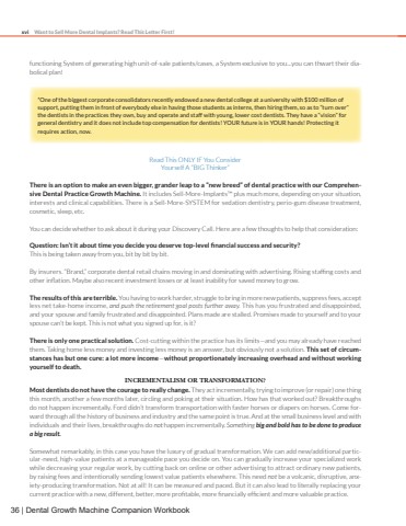 xvi Want to Sell More Dental Implants? Read This Letter First! functioning System of generating high unit-of-sale patients/cases, a System exclusive to you%u2026you can thwart their diabolical plan!*One of the biggest corporate consolidators recently endowed a new dental college at a university with $100 million of support, putting them in front of everybody else in having those students as interns, then hiring them, so as to %u201cturn over%u201d the dentists in the practices they own, buy and operate and staff with young, lower cost dentists. They have a %u201cvision%u201d for general dentistry and it does not include top compensation for dentists! YOUR future is in YOUR hands! Protecting it requires action, now.Read This ONLY IF You ConsiderYourself A %u201cBIG Thinker%u201dThere is an option to make an even bigger, grander leap to a %u201cnew breed%u201d of dental practice with our Comprehensive Dental Practice Growth Machine. It includes Sell-More-Implants%u2122 plus much more, depending on your situation, interests and clinical capabilities. There is a Sell-More-SYSTEM for sedation dentistry, perio-gum disease treatment, cosmetic, sleep, etc.You can decide whether to ask about it during your Discovery Call. Here are a few thoughts to help that consideration:Question: Isn%u2019t it about time you decide you deserve top-level financial success and security?This is being taken away from you, bit by bit by bit.By insurers. %u201cBrand,%u201d corporate dental retail chains moving in and dominating with advertising. Rising staffing costs and other inflation. Maybe also recent investment losses or at least inability for saved money to grow.The results of this are terrible. You having to work harder, struggle to bring in more new patients, suppress fees, accept less net take-home income, and push the retirement goal posts further away. This has you frustrated and disappointed, and your spouse and family frustrated and disappointed. Plans made are stalled. Promises made to yourself and to your spouse can%u2019t be kept. This is not what you signed up for, is it?There is only one practical solution. Cost-cutting within the practice has its limits%u2014and you may already have reached them. Taking home less money and investing less money is an answer, but obviously not a solution. This set of circumstances has but one cure: a lot more income%u2014without proportionately increasing overhead and without working yourself to death.INCREMENTALISM OR TRANSFORMATION?Most dentists do not have the courage to really change. They act incrementally, trying to improve (or repair) one thing this month, another a few months later, circling and poking at their situation. How has that worked out? Breakthroughs do not happen incrementally. Ford didn%u2019t transform transportation with faster horses or diapers on horses. Come forward through all the history of business and industry and the same point is true. And at the small business level and with individuals and their lives, breakthroughs do not happen incrementally. Something big and bold has to be done to produce a big result.Somewhat remarkably, in this case you have the luxury of gradual transformation. We can add new/additional particular-need, high-value patients at a manageable pace you decide on. You can gradually increase your specialized work while decreasing your regular work, by cutting back on online or other advertising to attract ordinary new patients, by raising fees and intentionally sending lowest value patients elsewhere. This need not be a volcanic, disruptive, anxiety-producing transformation. Not at all! It can be measured and paced. But it can also lead to literally replacing your current practice with a new, different, better, more profitable, more financially efficient and more valuable practice.Want to Sell More Dental Implants? Read This Letter First! xviiYou have a successful practice. But it%u2019s not unusual to have wound up creating and building a kind of success that is ultimately more of a trap and more of a source of stress and anxiety than you envisioned. The writer Oscar Wilde once said, ruefully, %u201cI%u2019d quit writing but I can%u2019t, I%u2019m too famous.%u201d In this way, success can actually, ironically, become a form of failure! It%u2019s not too late. You can keep the best parts and aspects of your practice but replace the fragile, stressful, income limiting aspects. THE DENTAL GROWTH MACHINE%u2122 keeps and strengthens the practice but changes the patients and re-engineers the finances. Look into this!Let%u2019s talk! Sincerely,Parthiv Shah36 | Dental Growth Machine Companion Workbook