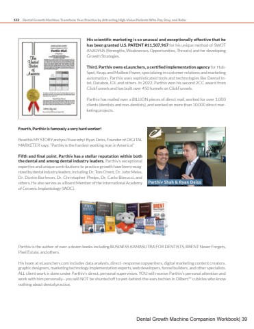 Sell-More-Implants%u2122 (and Dental Growth Machine) are Powered By eLaunchers, a business growth agency. We specialize in developing powerful brands.The very hands-on CEO and Founder of eLaunchers and developer of Sell-More-Implants%u2122 is Parthiv Shah. After serving in the Indian Air Force, Parthiv immigrated to America, earned an MBA in Marketing, and has worked in direct-response marketing for over 30 years. He is a True American Success Story, having started a unique marketing services company from scratch and build it to pre-eminence in the field. You can read the complete %u201cMy Story %u2013 by Parthiv Shah%u201d at the end of this insert, but here is what you most need to know in brief:Parthiv is, first and foremost, a data scientist. He %u201clooks into%u201d your practice and patient infor,mation and %u201csees%u201d what you can%u2019t, with the naked eye. Using highly sophisticated data-mining, modeling, and matching tools, he is, quite simply, able to find and extract %u201cstored value%u201d inside your past and present, inactive and active patient records, as well as past and current leads that you cannot do on your own, with %u201cthe naked eye.%u201dSecond, Parthiv Shah is a direct-response marketing specialist. He has studied all the works and strategies of over 100 leaders in this field, including Dan Kennedy, Jay Abraham, Seth Go,din, Russell Brunson, and Brian Kurtz, and he has invested well over $1million in his focused education. Parthiv is also the author of 12 books. Since 2001, he has applied all this knowledge directly to dental practices. The Sell-More-Implants%u2122 System is his latest breakthrough. About the Author122 Dental Growth Machine: Transform Your Practice by Attracting High-Value Patients Who Pay, Stay, and ReferHis scientific marketing is so unusual and exceptionally effective that he has been granted U.S. PATENT #11,507,967 for his unique method of SWOT ANALYSIS (Strengths, Weaknesses, Opportunities, Threats) and for developing Growth Strategies.Third, Parthiv owns eLaunchers, a certified implementation agency for HubSpot, Keap, and Mailbox Power, specializing in customer relations and marketing automation. Parthiv uses sophisticated tools and technologies like Dental Intel, Databox, IDI, and others. In 2022, Parthiv won his second 2CC award from ClickFunnels and has built over 450 funnels on ClickFunnels.Parthiv has mailed over a BILLION pieces of direct mail, worked for over 1,000 clients (dentists and non-dentists), and worked on more than 10,000 direct marketing projects.Fourth, Parthiv is famously a very hard worker!Read his MY STORY and you%u2019ll see why! Ryan Deiss, Founder of DIGITAL MARKETER says: %u201cParthiv is the hardest working man in America!%u201dFifth and final point, Parthiv has a stellar reputation within both the dental and among dental industry leaders. Parthiv%u2019s exceptional expertise and unique contributions to practice growth have been recognized by dental industry leaders, including Dr. Tom Orent, Dr. John Meiss, Dr. Dustin Burleson, Dr. Christopher Phelps, Dr. Carlo Biasucci, and others. He also serves as a Board Member of the International Academy of Ceramic Implantology (IAOC).Parthiv is the author of over a dozen books including BUSINESS KAMASUTRA FOR DENTISTS, BRENT Never Forgets, Pixel Estate, and others.His team at eLaunchers.com includes data analysts, direct- response copywriters, digital marketing content creators, graphic designers, marketing technology implementation experts, web developers, funnel builders, and other specialists. ALL client work is done under Parthiv%u2019s direct, personal supervision. YOU will receive Parthiv%u2019s personal attention and work with him personally%u2013 you will NOT be shunted off to wet-behind-the-ears techies in Dilbert%u2122 cubicles who know nothing about dental practice.Dental Growth Machine Companion Workbook| 39
