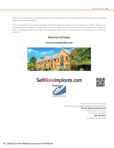About the Author 125back, but I do not have to%u2013and will not%u2013waiver from my successful formula! I will show you what I know so you can achieve greater success than ever before.That is a snapshot of my business background and the experiences that led me to conceive my %u201cdream.%u201d Today, I own a multinational technology firm with offices in three countries and a team of technologists, programmers, system architects, designers, writers, marketers, and operations professionals%u2014each driven by a shared passion for one thing: RESULTS!Book Your Call Todayat www.meetparthiv.comSince 2002, Hundreds of Clients, Thousands of Campaigns, and Billions of Pieces MailedParthiv Shah, eLaunchers.com 13236 Executive Park Terrace Germantown, MD 20874301.760.3953pshah@elaunchers.com42 | Dental Growth Machine Companion Workbook
