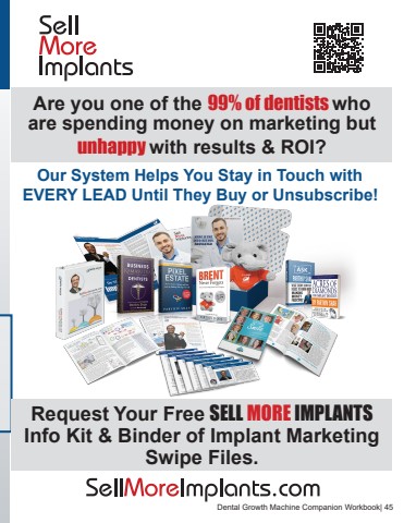Our System Helps You Stay in Touch with EVERY LEAD Until They Buy or Unsubscribe!Request Your Free SELL MORE IMPLANTS Info Kit & Binder of Implant Marketing Swipe Files. Are you one of the 99% of dentists who are spending money on marketing but unhappy with results & ROI?Dental Growth Machine Companion Workbook| 45