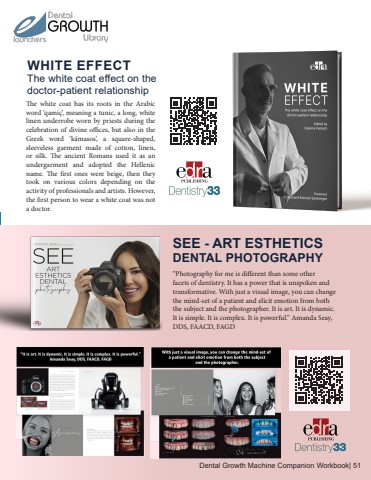 %u201cPhotography for me is different than some other facets of dentistry. It has a power that is unspoken and transformative. With just a visual image, you can change the mind-set of a patient and elicit emotion from both the subject and the photographer. It is art. It is dynamic. It is simple. It is complex. It is powerful.%u201d Amanda Seay, DDS, FAACD, FAGDThe white coat has its roots in the Arabic word %u2018qami%u00e7%u2019, meaning a tunic, a long, white linen underrobe worn by priests during the celebration of divine offices, but also in the Greek word %u2018k%u00e1masos%u2019, a square-shaped, sleeveless garment made of cotton, linen, or silk. The ancient Romans used it as an undergarment and adopted the Hellenic name. The first ones were beige, then they took on various colors depending on the activity of professionals and artists. However, the first person to wear a white coat was not a doctor.SEE - ART ESTHETICSDENTAL PHOTOGRAPHYWHITE EFFECTThe white coat effect on the doctor-patient relationshipDental Growth Machine Companion Workbook| 51
