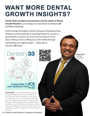 Dentistry33 is a new international e-journal and digital magazine from Edra Publishing US, LLC aimed to provide dentists an instrument to easily get access to worldwide dentistry news and updates, with experts%u2019 opinions about everyday clinical problems and to help them with innovative and scientific-based solutions, thanks to an outstanding scientific board, which collect the leading Key Opinion Leaders from the Dentistry industry.Parthiv Shah, president of eLaunchers and the author of Dental Growth Machine is an exciting new contributor to Dentistry33by EDRA Publishing. Parthiv brings his insights of Direct Response Marketing, Data Analytics, and his experience in guiding Dentist to success in growing their practices. So, if you want to discover more about selling in print, crafting your multi-media message and building your digital empire %u2014 Subscribe to Dentistry33 today!WANT MORE DENTAL GROWTH INSIGHTS?Parthiv ShahPresidenteLaunchers52 | Dental Growth Machine Companion Workbook