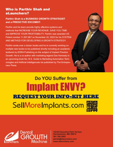 Transform Your Practice by AttractingHigh-Value Patients Who Pay, Stay, and ReferDental GrowthMachineDentalBusinessWho is Parthiv Shah and eLaunchers?Parthiv Shah is a BUSINESS GROWTH STRATEGIST and a PREDICTIVE EXCOMIST.Parthiv and his team provide highly eff ective systems and methods that INCREASE YOUR REVENUE, SAVE YOU TIME and IMPROVE YOUR PROFITABILITY. Parthiv was awarded US Patent number 11,507,967 on November 22, 2022 for his SYSTEM AND METHOD FOR DEVELOPING A GROWTH STRATEGY.Parthiv wrote over a dozen books and he is currently working on multiple new books to be published shortly including an academic textbook by EDRA Publishing on the subject of Implant Practice Growth. He is a co-author with marketing legend Dan Kennedy in an upcoming book No. B.S. Guide to Marketing Automation Technologies and Artifi cial Intelligenceto be published by The Entrepreneur Press. Parthiv Shah COMPANION WORKBOOKDo YOU Suff er fromImplant ENVY?REQUEST YOUR INFO-KIT HERE13236 Executive Park TerraceGermantown, MD 20874301.760.3953pshah@elaunchers.comwww.elaunchers.com