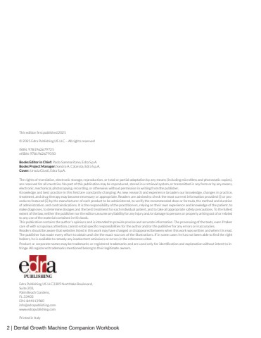 This edition first published 2025%u00a9 2025 Edra Publishing US LLC %u2013 All rights reservedISBN: 9781962679725eISBN: 9781962679350Books Editor in Chief: Paola Sammaritano, Edra S.p.A.Books Project Manager: Sandra A. Calarota, Edra S.p.A.Cover: Ursula Giusti, Edra S.p.A.The rights of translation, electronic storage, reproduction, or total or partial adaptation by any means (including microfilms and photostatic copies), are reserved for all countries. No part of this publication may be reproduced, stored in a retrieval system, or transmitted in any form or by any means, electronic, mechanical, photocopying, recording, or otherwise, without permission in writing from the publisher.Knowledge and best practice in this field are constantly changing: As new research and experience broaden our knowledge, changes in practice, treatment, and drug therapy may become necessary or appropriate. Readers are advised to check the most current information provided (i) or procedures featured (ii) by the manufacturer of each product to be administered, to verify the recommended dose or formula, the method and duration of administration, and contraindications. It is the responsibility of the practitioners, relying on their own experience and knowledge of the patient, to make diagnoses, to determine dosages and the best treatment for each individual patient, and to take all appropriate safety precautions. To the fullest extent of the law, neither the publisher nor the editors assume any liability for any injury and/or damage to persons or property arising out of or related to any use of the material contained in this book.This publication contains the author%u2019s opinions and is intended to provide precise and accurate information. The processing of the texts, even if taken care of with scrupulous attention, cannot entail specific responsibilities for the author and/or the publisher for any errors or inaccuracies.Readers should be aware that websites listed in this work may have changed or disappeared between when this work was written and when it is read.The publisher has made every effort to obtain and cite the exact sources of the illustrations. If in some cases he has not been able to find the right holders, he is available to remedy any inadvertent omissions or errors in the references cited.Product or corporate names may be trademarks or registered trademarks and are used only for identification and explanation without intent to infringe. All registered trademarks mentioned belong to their legitimate owners.Edra Publishing US LLC3309 Northlake Boulevard,Suite 203,Palm Beach Gardens,FL 33403EIN: 844113980info@edrapublishing.comwww.edrapublishing.comPrinted in Italy2 | Dental Growth Machine Companion Workbook