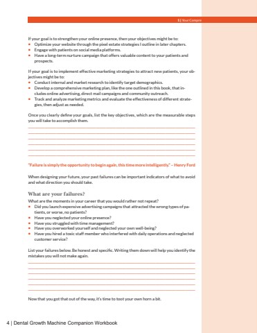 1 | Your Comprehensive Growth Strategy 7If your goal is to strengthen your online presence, then your objectives might be to:%u2022 Optimize your website through the pixel estate strategies I outline in later chapters.%u2022 Engage with patients on social media platforms.%u2022 Have a long-term nurture campaign that offers valuable content to your patients and prospects.If your goal is to implement effective marketing strategies to attract new patients, your objectives might be to:%u2022 Conduct internal and market research to identify target demographics.%u2022 Develop a comprehensive marketing plan, like the one outlined in this book, that includes online advertising, direct mail campaigns and community outreach.%u2022 Track and analyze marketing metrics and evaluate the effectiveness of different strategies, then adjust as needed.Once you clearly define your goals, list the key objectives, which are the measurable steps you will take to accomplish them. ______________________________________________________________________________________________________________________________________________________________________________________________________________________________________________________________________________________________________________________________________________________________________________________________________________________________________________________________________________________________________________________________________________________________________________________________________________________________%u201cFailure is simply the opportunity to begin again, this time more intelligently.%u201d %u2013 Henry FordWhen designing your future, your past failures can be important indicators of what to avoid and what direction you should take.What are your failures?What are the moments in your career that you would rather not repeat?%u2022 Did you launch expensive advertising campaigns that attracted the wrong types of patients, or worse, no patients?%u2022 Have you neglected your online presence?%u2022 Have you struggled with time management?%u2022 Have you overworked yourself and neglected your own well-being?%u2022 Have you hired a toxic staff member who interfered with daily operations and neglected customer service?List your failures below. Be honest and specific. Writing them down will help you identify the mistakes you will not make again. ______________________________________________________________________________________________________________________________________________________________________________________________________________________________________________________________________________________________________________________________________________________________________________________________________________________________________________________________________________________________________________________________________________________________________________________________________________________________Now that you got that out of the way, it%u2019s time to toot your own horn a bit.8 Dental Growth Machine: Transform Your Practice by Attracting High-Value Patients Who Pay, Stay, and Refer WorkbookWhat are your greatest successes so far in your practice?%u2022 Do you have a great reputation with your patients?%u2022 Are you an exceptional leader who can motivate, support and direct your staff?%u2022 Do you have a firm grasp on money management and monitor spending with ease and efficiency?%u2022 Do you have a particularly effective marketing strategy?%u2022 Have you mastered asking for and receiving positive online reviews?List your successes below. This will be your launching pad to achieve even greater success in the months and years to come. ______________________________________________________________________________________________________________________________________________________________________________________________________________________________________________________________________________________________________________________________________________________________________________________________________________________________________________________________________________________________________________________________________________________________________________________________________________________________We%u2019ve discussed your goals, objectives, failures and successes. Now, let%u2019s talk about order and sequence.What are your main priorities for the next six months? What about the next year? Five years?%u2022 Do you want to grow your practice by attracting more high-value patients looking for dental implants and other cosmetic services?%u2022 Would you like to get more value from the patient list you already have?%u2022 Do you want to develop new relationships with general dentists and other health care professionals in your area to generate referrals?%u2022 Are there parts of your practice%u2019s operational side that need improvement in terms of time management and customer service?Think about the next several months, next year, and the next five years. What are your main priorities for your practice? ______________________________________________________________________________________________________________________________________________________________________________________________________________________________________________________________________________________________________________________________________________________________________________________________________________________________________________________________________________________________________________________________________________________________________________________________________________________________Now, let%u2019s talk about your wish list.If you could wave your magic wand and have the practice of your dreams, what would it look like?%u2022 Would you have a reputation in th