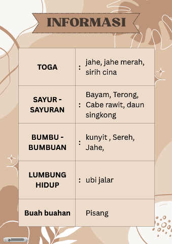 INFORMASI jahe, jahe merah, TOGA : sirih cina Bayam, Terong, SAYUR - SAYURAN : Cabe rawit, daun singkong BUMBU - kunyit , Sereh, BUMBUAN : Jahe, LUMBUNG : ubi jalar HIDUP Buah buahan Pisang