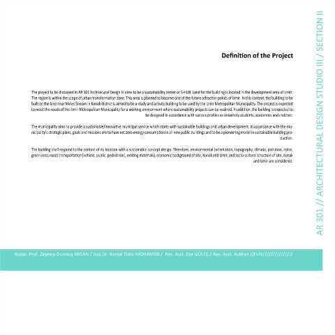 The project to be discussed in AR 301 Architecural Design III aims to be a sustainability center or S-HUB. Land for the building is located in the development area of Izmir. SU T