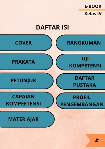 E-BOOK Kelas IV DAFTAR ISI COVER RANGKUMAN UJI PRAKATA KOMPETENSI PETUNJUK DAFTAR PUSTAKA CAPAIAN PROFIL KOMPEETENSI PENGEMBANGAN MATER AJAR 2