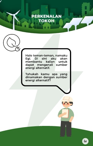 PERKENALAN TOKOH Halo teman-teman, namaku Egi. Di sini aku akan membantu kalian untuk dapat mengenali sumber energi alternatif. Tahukah kamu apa yang dinamakan dengan sumber energi alternatif? iv