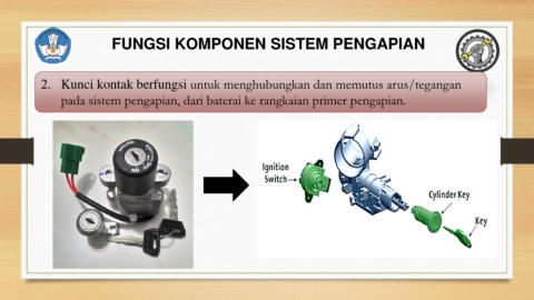 FUNGSI KOMPONEN SISTEM PENGAPIAN 2. Kunci kontak berfungsi untuk menghubungkan dan memutus arus/tegangan pada sistem pengapian, dari baterai ke rangkaian primer pengapian.