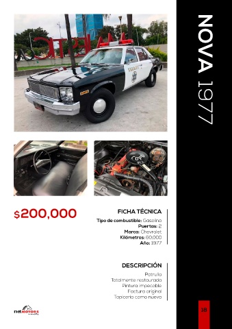 $200,000 FICHA TÉCNICA NOVA 1977 Tipo de combustible: Gasolina Puertas: 2 Marca: Chevrolet Kilómetros: 60,000 Año: 1977 DESCRIPCIÓN Patrulla Totalmente restaurada Pintura impecable Factura original Tapicería como nueva net 18 Car Collection Gallery