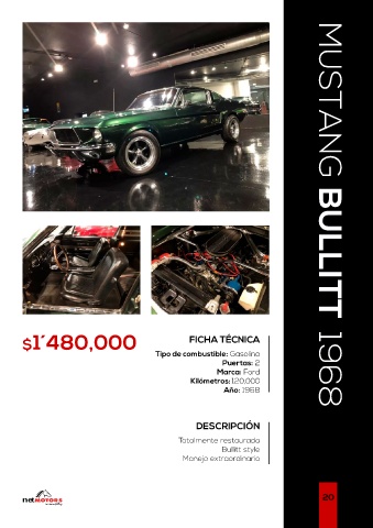 $1´480,000 FICHA TÉCNICA MUSTANG BULLITT 1968 Tipo de combustible: Gasolina Puertas: 2 Marca: Ford Kilómetros: 120,000 Año: 1968 DESCRIPCIÓN Totalmente restaurada Bullitt style Manejo extraordinario net 20 Car Collection Gallery