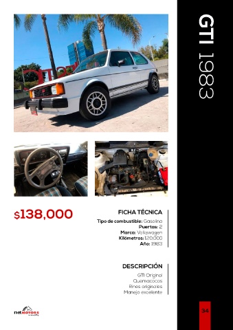 $138,000 FICHA TÉCNICA GTI 1983 Tipo de combustible: Gasolina Puertas: 2 Marca: Volkswagen Kilómetros: 120,000 Año: 1983 DESCRIPCIÓN GTI Original Quemacocos Rines originales Manejo excelente net 34 Car Collection Gallery
