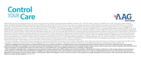 State Corporation Commission MC – 5134), VT (Vermont Lender License No. 6384), WA (Consumer Loan # CL-9392),WV, WI, WY (WY-DBA AAG Reverse Mortgage Lender/Broker License No. 2331). AAG is an