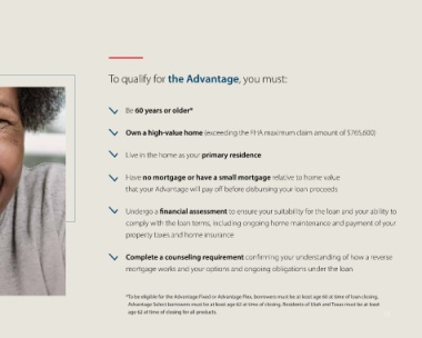 * To be eligible for the Advantage Fixed or Advantage Flex, borrowers must be at least age 60 at time of loan closing.