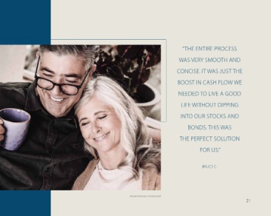 “THE ENTIRE PROCESS WAS VERY SMOOTH AND CONCISE. IT WAS JUST THE BOOST IN CASH FLOW WE NEEDED TO LIVE A GOOD LIFE WITHOUT DIPPING INTO OUR STOCKS AND BONDS. THIS WAS THE PERFECT SOLUTION FOR US.” BRUCE C. Actual borrowers not pictured 21