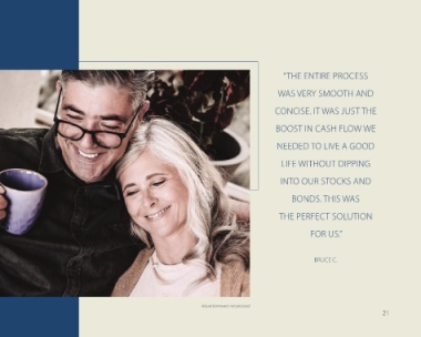 “THE ENTIRE PROCESS WAS VERY SMOOTH AND CONCISE. IT WAS JUST THE BOOST IN CASH FLOW WE NEEDED TO LIVE A GOOD LIFE WITHOUT DIPPING INTO OUR STOCKS AND BONDS. THIS WAS THE PERFECT SOLUTION FOR US.” BRUCE C. Actual borrowers not pictured 21