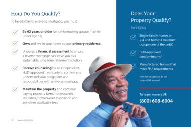 To be eligible for a reverse mortgage, you must: Property Qualify?