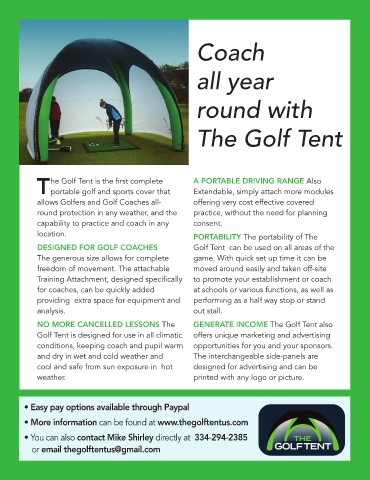 DESIGNED FOR GOLF COACHES Golf Tent can be used on all areas of the