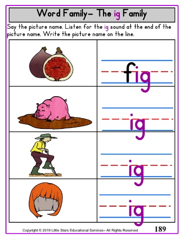 Word Family– The ig Family Say the picture name. Listen for the ig sound at the end of the picture name. Write the picture name on the line. fig ig ig ig Copyright © 2019 Little Stars Educational Services– All Rights Reserved 189