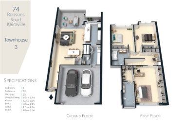 74 Robsons Road Keiraville Townhouse 3 SPECIFICATIONS Bedrooms | 3 Bathrooms | 2.5 Garaging | 2.5 Living & Dining | 6.4m x 5.2m Kitchen | 4.6m x 3.0m Bed 1 | 6.0m x 4.1m Bed 2 | 4.7m x 4.0m Bed 3 | 4.0m x 4.0m GROUND FLOOR FIRST FLOOR