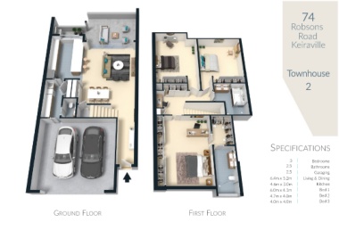 74 Robsons Road Keiraville Townhouse 2 SPECIFICATIONS 3 | Bedrooms 2.5 | Bathrooms 2.5 | Garaging 6.4m x 5.2m | Living & Dining 4.6m x 3.0m | Kitchen 6.0m x 4.1m | Bed 1 4.7m x 4.0m | Bed 2 4.0m x 4.0m | Bed 3 GROUND FLOOR FIRST FLOOR