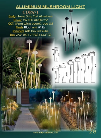 ALUMINUM MUSHROOM LIGHT CDPA71 Body: Heavy Duty Cast Aluminum Power: 7W LED AC/DC 12V CCT: Warm White 3000K / 700 LM Finish: Black and White Included: ABS Ground Spike Size: 27.5” (H) x 7” (W) x 1.62” (L) 26 www.toby-ambrose.com 26