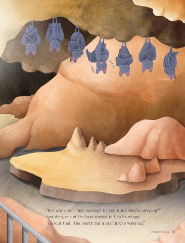 “But why aren’t they moving? Do you think they’re sleeping?” Just then, one of the bats started to flap its wings. “Look at that! The fourth bat is starting to wake up.” 01 Bats in the Cave 01 Bats in the Cave 07