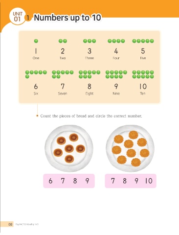 UNIT 01 1 Numbers up to 10 1 2 3 4 5 One Two Three Four Five 6 7 8 9 10 Six Seven Eight Nine Ten Count the pieces of bread and circle the correct number. 6 7 8 9 7 8 9 10 08 PlayFACTO Monthly 1-01