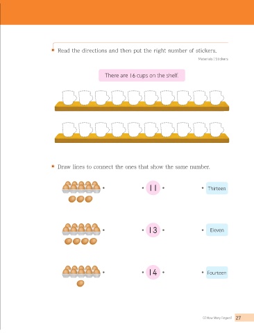 Read the directions and then put the right number of stickers. Materials | Stickers There are 16 cups on the shelf. Draw lines to connect the ones that show the same number. 11 Thirteen 13 Eleven 14 Fourteen 02 How Many Fingers? 27
