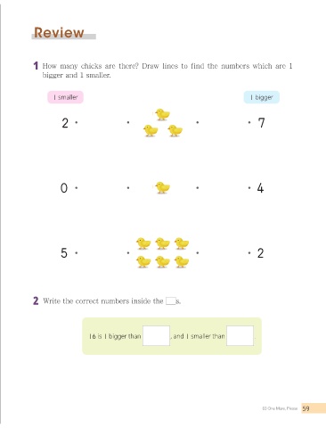 Review 1 How many chicks are there? Draw lines to find the numbers which are 1 bigger and 1 smaller. 1 smaller 1 bigger 2 7 0 4 5 2 2 Write the correct numbers inside the s. 16 is 1 bigger than , and 1 smaller than . 03 One More, Please 59