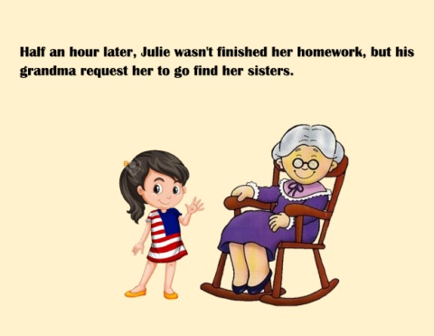 Half an hour later, Julie wasn't finished her homework, but his grandma request her to go find her sisters.