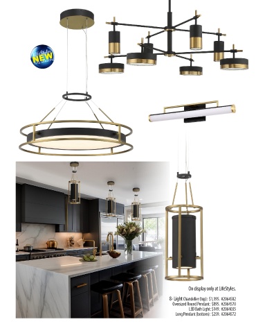 On display only at LifeStyles. 8- Light Chandelier (top): $1,195. #2064582 Oversized Round Pendant: $895. #2064570 LED Bath Light: $149. #2064035 Long Pendant (bottom): $259. #2064572