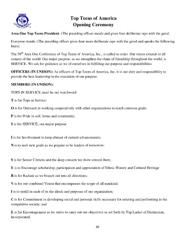 The 50 Area One Conference of Top Teens of America, Inc., is called to order. Our vision extends to all