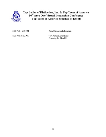 Top Ladies of Distinction, Inc. & Top Teens of America th 50 Area One Virtual Leadership Conference Top Teens of America Schedule of Events 5:00 PM – 6:30 PM Area One Awards Program 8:00 PM-10:30 PM TTA Virtual After Party Featuring DJ SLASH 73
