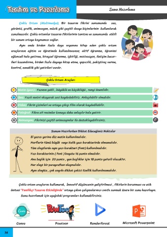 sunulmasıdır. Çoklu ortamlar tasarım fikirlerinin tanıtım ve sunumunda etkili