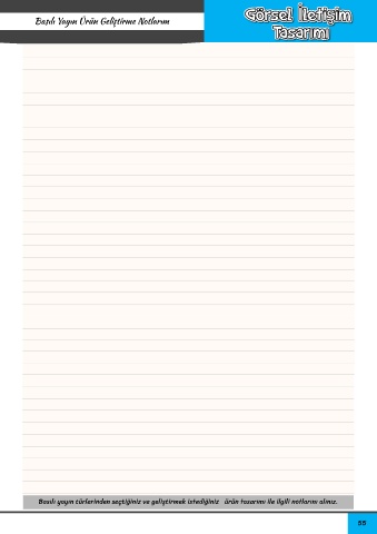 TEKNOLOJİ VE TASARIMIN TEMELLERİ Basılı Yayın Ürün Geliştirme Notlarım Teknoloji ve Tasarımı Öğreniyorum Basılı yayın türlerinden seçtiğiniz ve geliştirmek istediğiniz ürün tasarımı ile ilgili notlarını alınız. 55