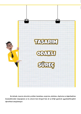 Bu ünitede, tasarım sürecinin; problem tanımlama, araştırma, planlama, oluşturma ve değerlendirme basamaklarından oluştuğunun ve bu sürecin hem bireysel hem de iş birliği yapılarak uygulanabileceğinin öğrenilmesi amaçlanmıştır. 36