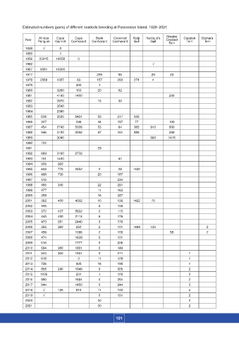 Estimated numbers (pairs) of different seabirds breeding at Possession Island, 1828–2021
