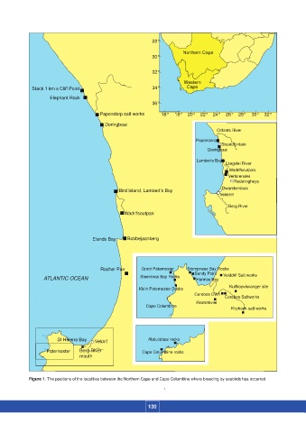 Figure 1. The positions of the localities between the Northern Cape and Cape Columbine where breeding by seabirds has occurred