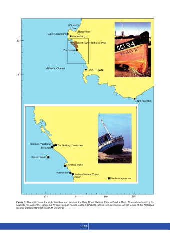 seabirds has occurred. Inserts: An African Penguin nesting under a longboat (above) and cormorants on the wreck of the Namaqua