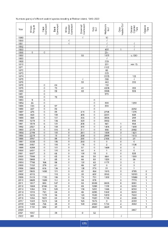 Numbers (pairs) of different seabird species breeding at Robben Island, 1949–2022
