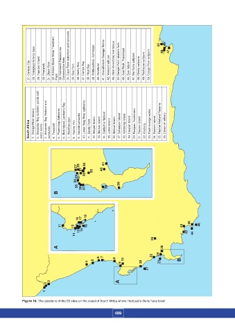 South Africa 1. Orange River estuary 2. Alexander Bay oxidation ponds and water works 3. Alexander Bay Harbour and surrounds 4. Tweepad 5. Papendorp Saltworks 6. Bird Island, Lambert's Bay 7. Wadrifsoutpan 8. Rocher Pan 9. Velddrif saltworks 10. Lower Berg River saltworks 11. Sandy Point 12. Malgas Island 13. Marcus Island 14. Saldanha Harbour 15. Jutten Island 16. Meeuw Island 17. Schaapen Island 18. Vondeling Island 19. Caspian Island 20. Rooipan, Yzerfontei