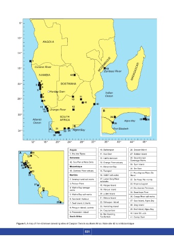 Figure 1. A map of the 43 known breeding sites of Caspian Tern in southern Africa. Note site 43 is in Mozambique